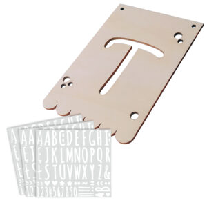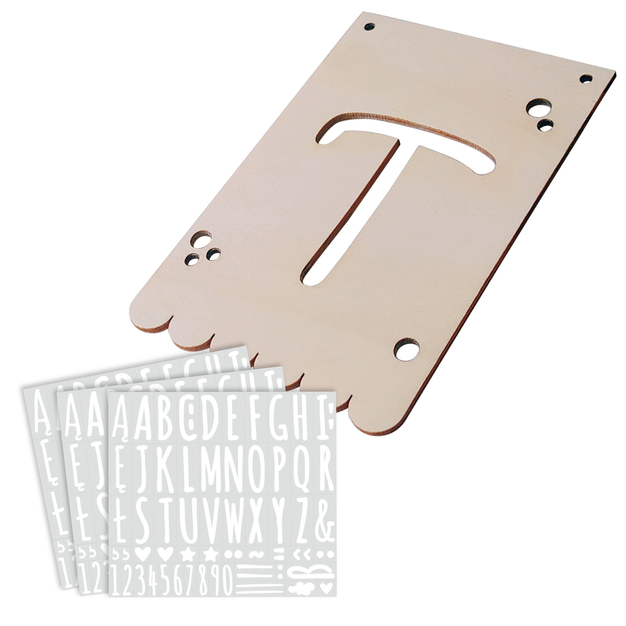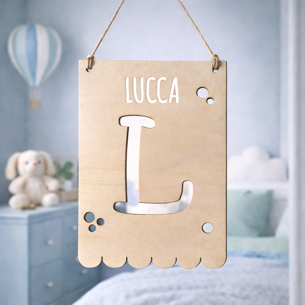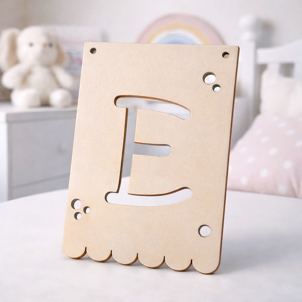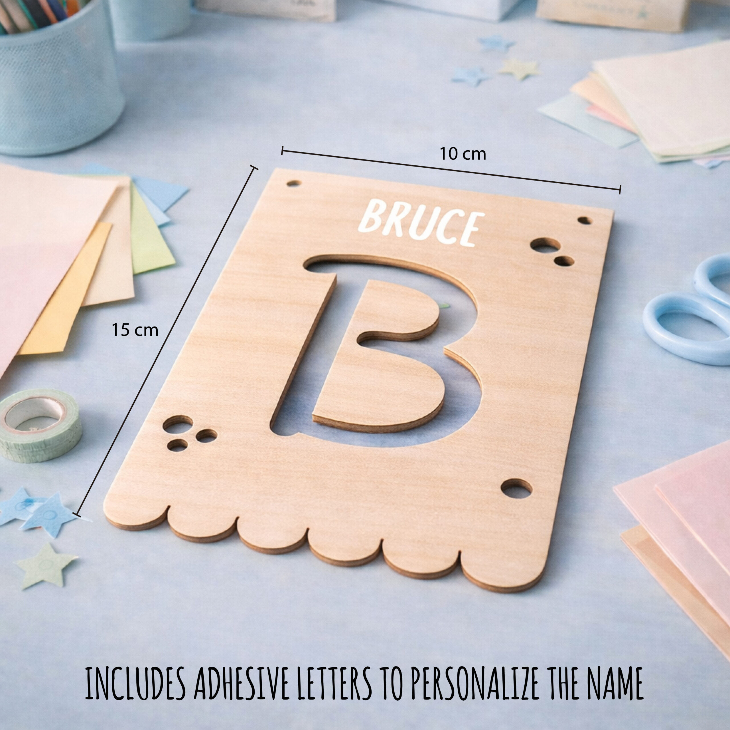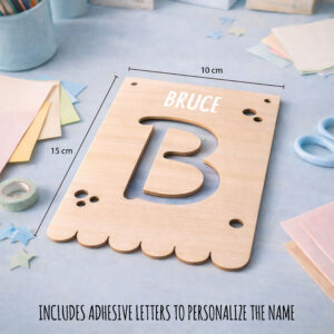 Decorative wooden pennant with an openwork initial. Ideal for decorating a child’s room. Includes a set of adhesive letters to personalize with the full name. Measures 10 x 15 cm.