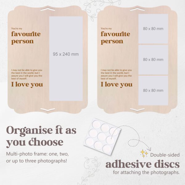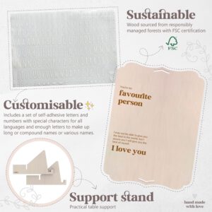 Wooden photo frame with a beautiful quote to give to that special someone. Includes a set of letters to personalize names, quotes, and dates. Includes adhesive for the photos, a tabletop stand, and a hanging hole. The back is smooth and beautiful, so you can stick more photos or decorate with a personal dedication, or add an envelope with a surprise gift such as plane tickets, a gift card, vouchers, a letter, or even money! A touching and lasting gift.