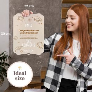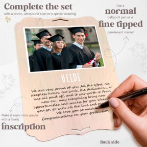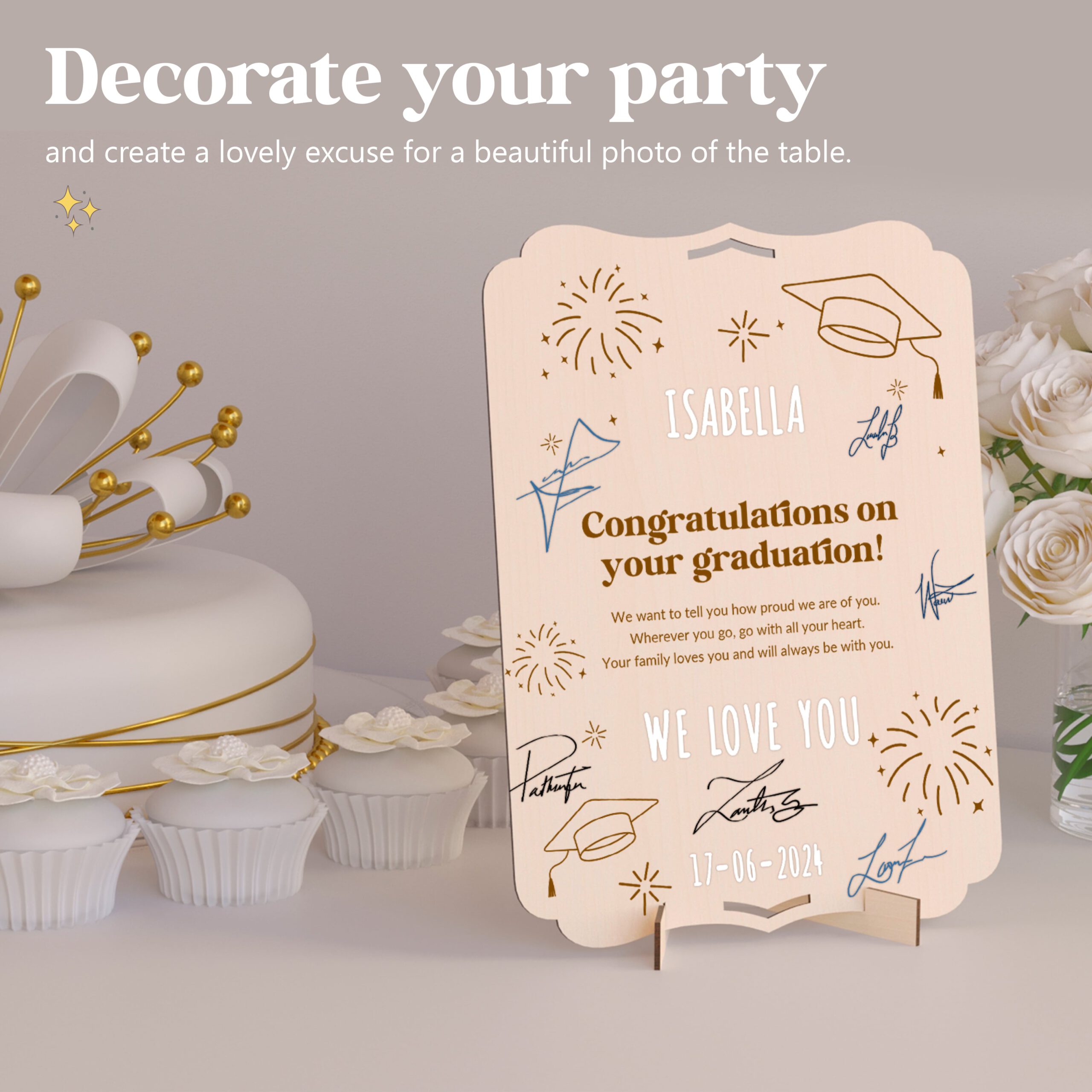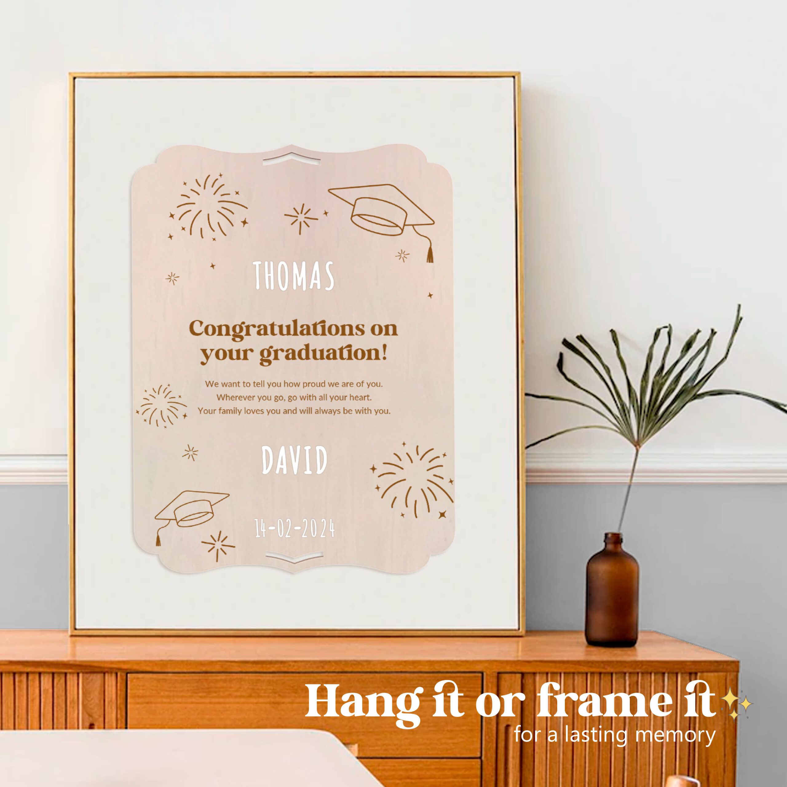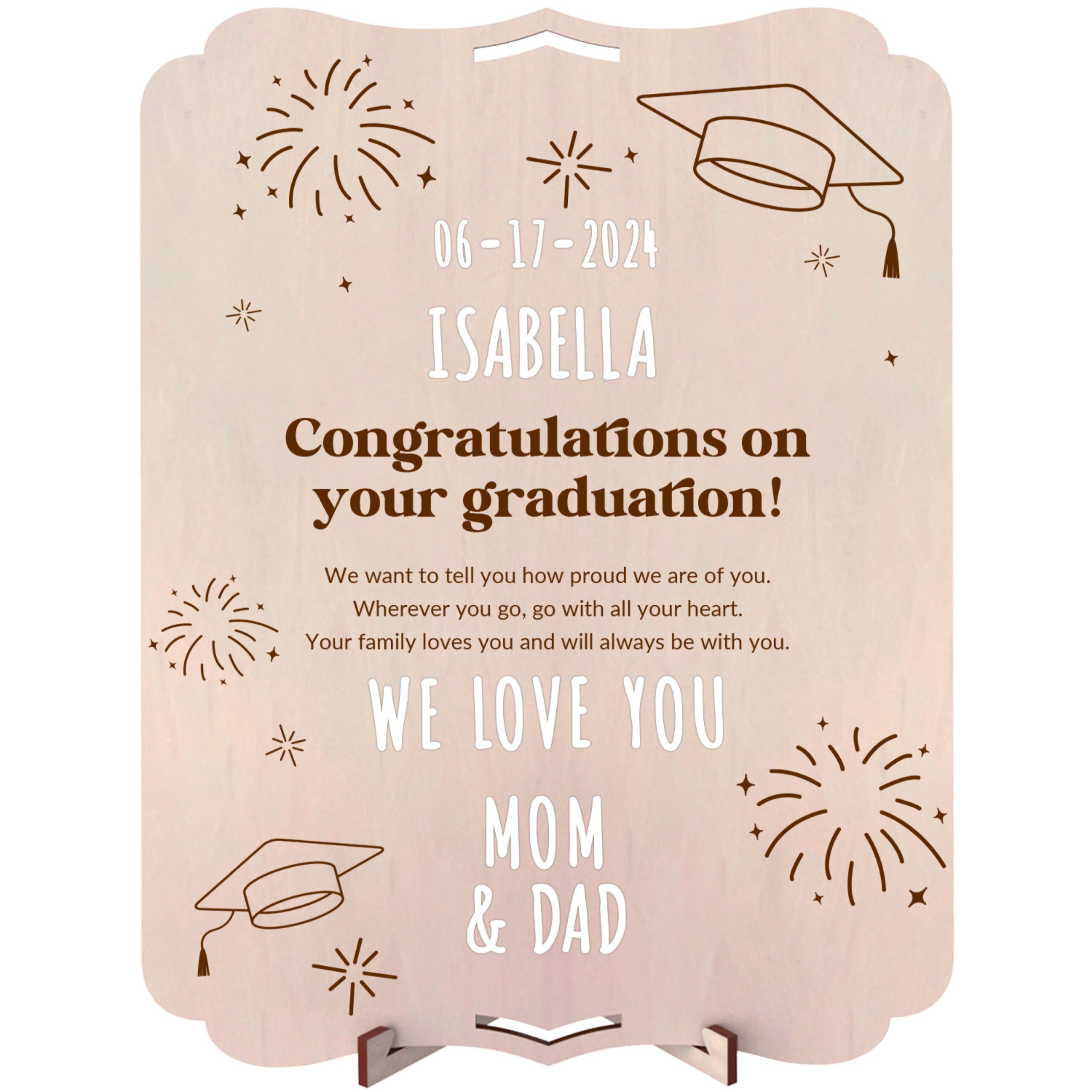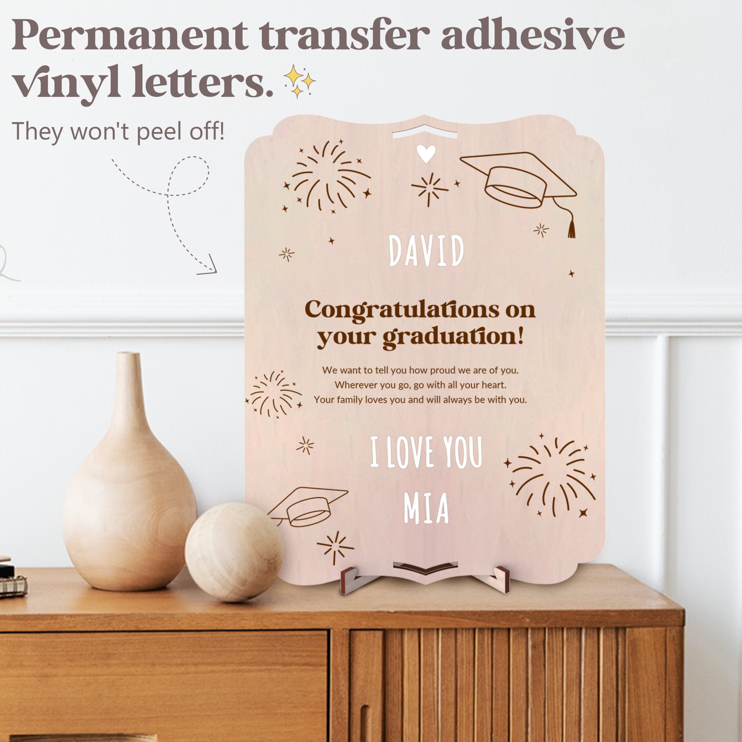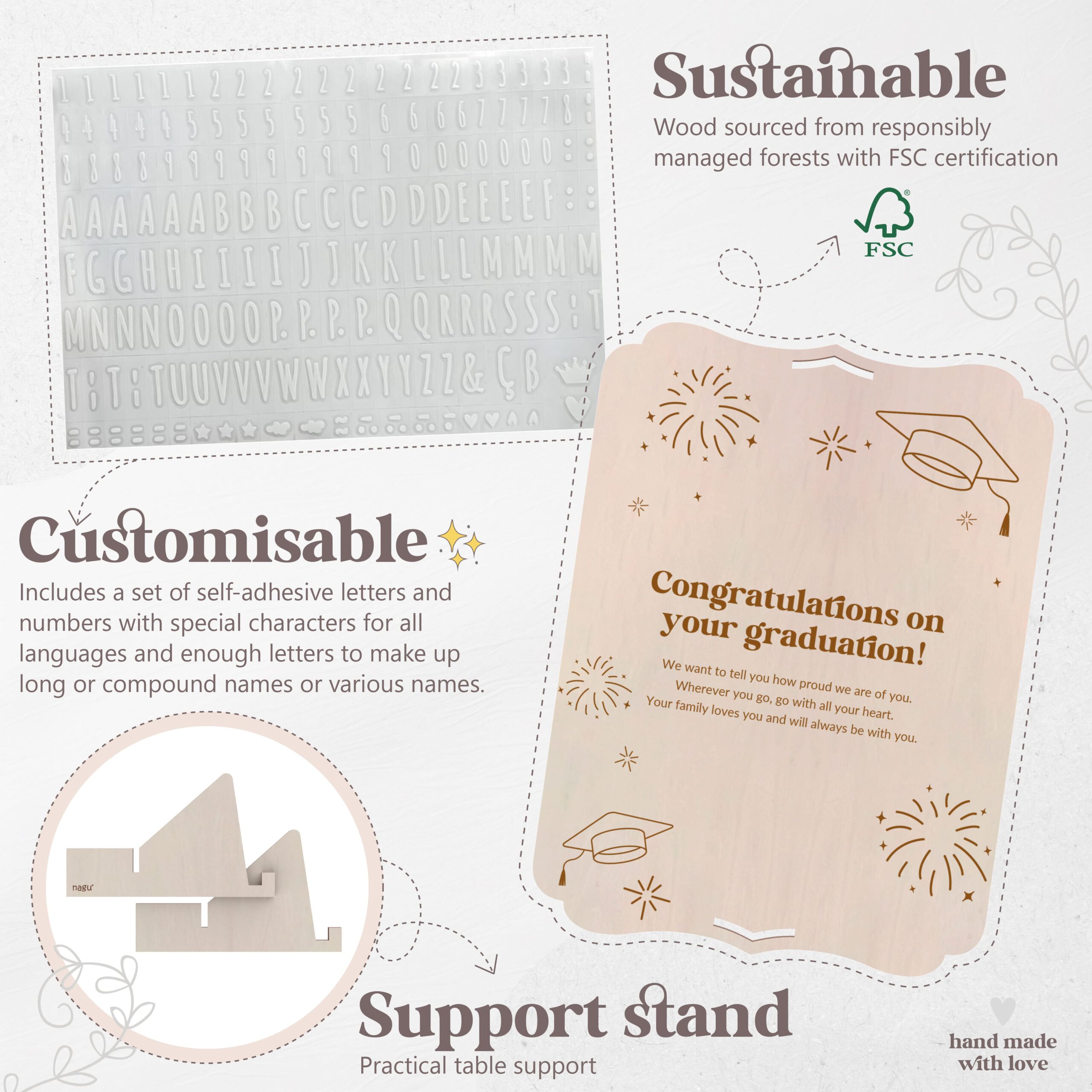 Large wooden greeting card with a beautiful graduation quote. Customizable with names, quotes, and dates using the included set of adhesive letters. Includes a table stand and hanging hole, as desired. The back is plain for adding a personal dedication or photos, or an envelope with surprise gifts such as letters, tickets, vouchers, or even money.