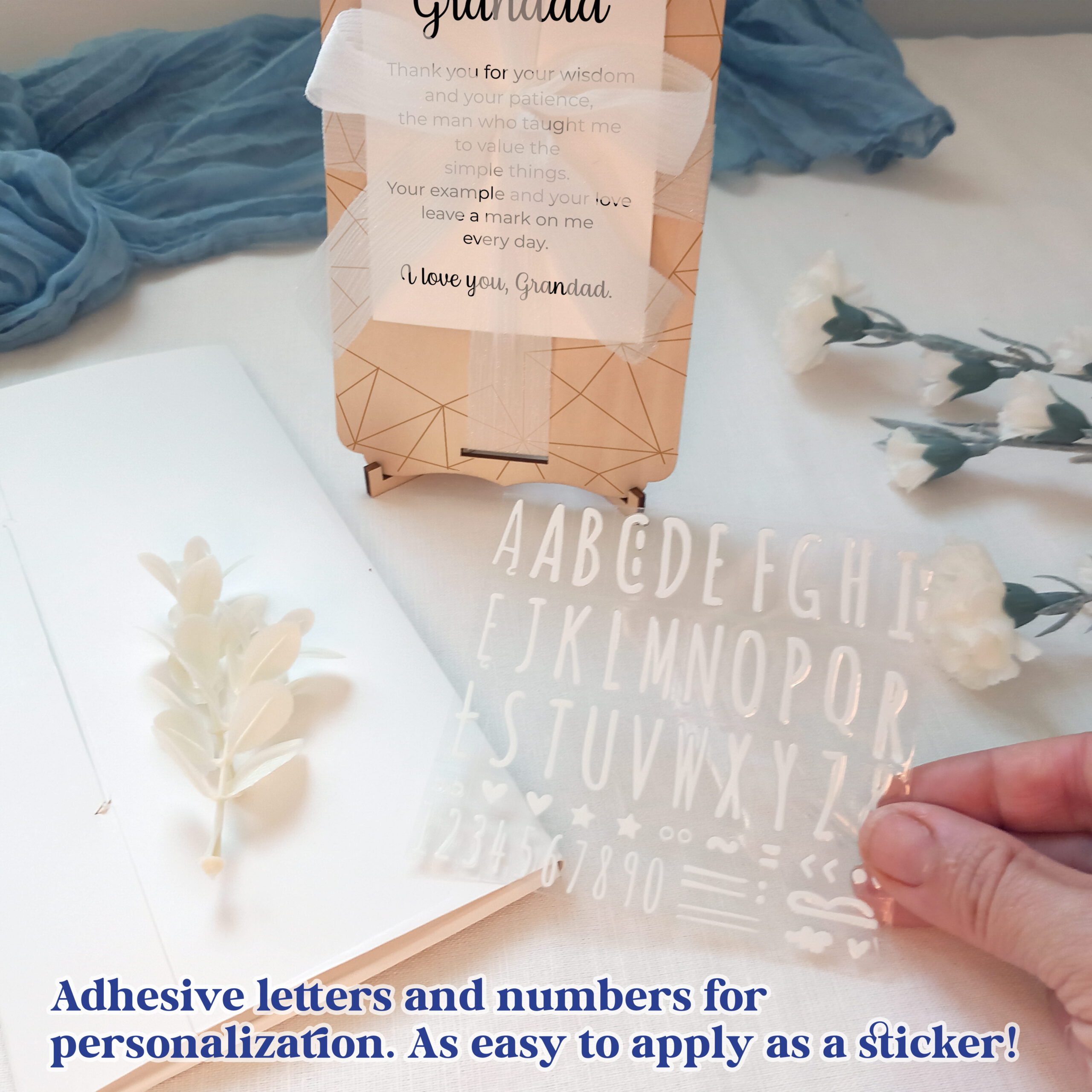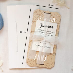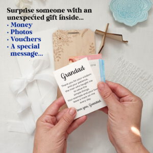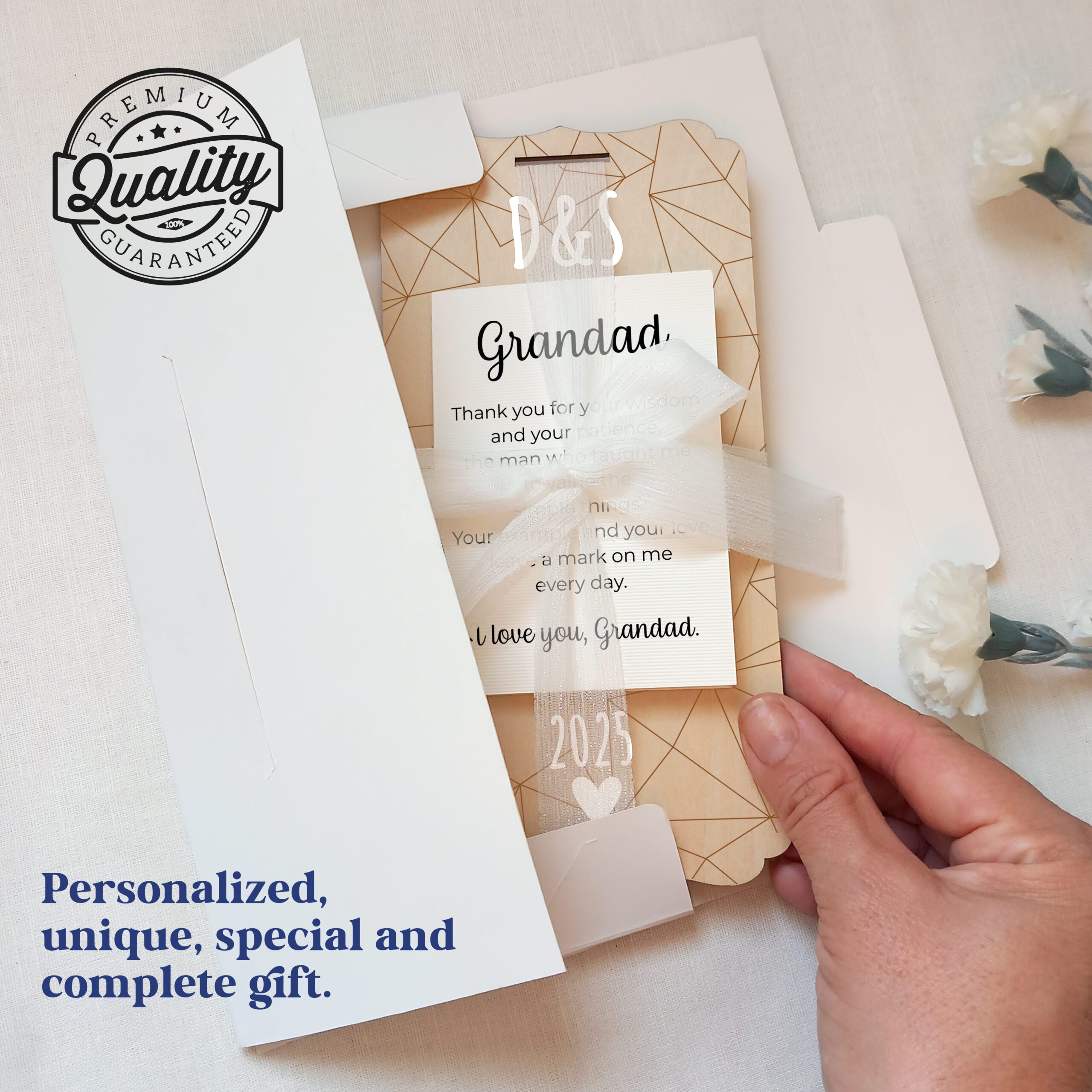 A beautiful and complete gift set for Grandpa. It includes a lovely engraved wooden card with a table stand, a laid paper card with a beautiful phrase, and a set of adhesive vinyl letters to personalize with names or dates. A unique and heartfelt gift for grandpas on Father’s Day, their birthday, or any special occasion. It also includes a thick white cardboard envelope and a beautiful silk ribbon to complete the set and make it a truly high-quality gift.