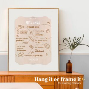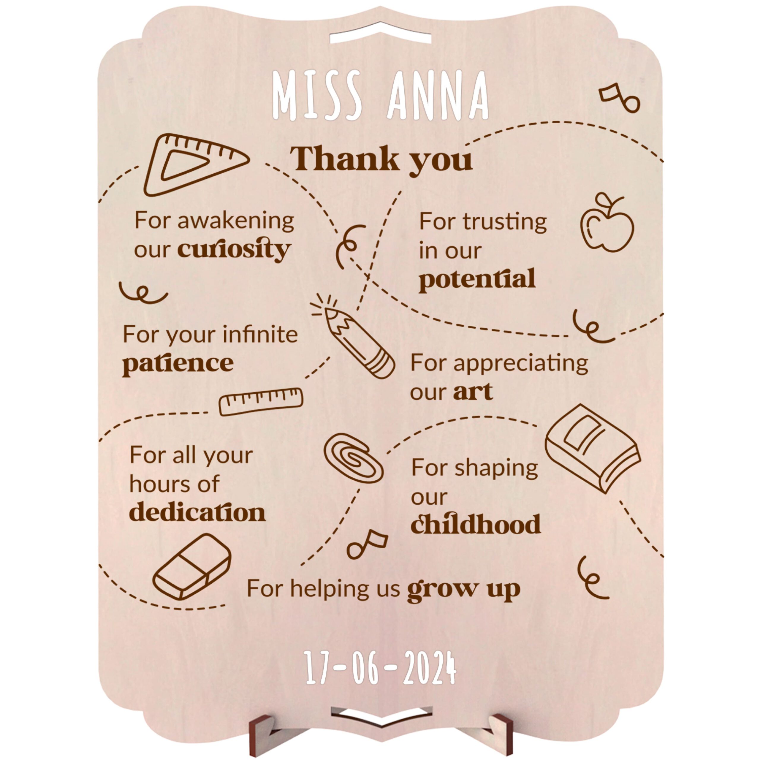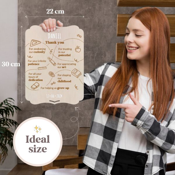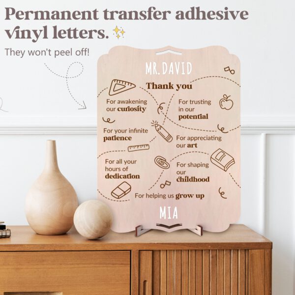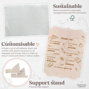 Large wooden greeting card. With beautiful thank you quotes for teachers of young children. Customizable with names, quotes, and dates thanks to the included set of adhesive letters. Includes a table stand and hanging hole, as desired. The back is plain for adding a personal dedication or photos, or an envelope with surprise gifts such as letters, tickets, vouchers, or even money.