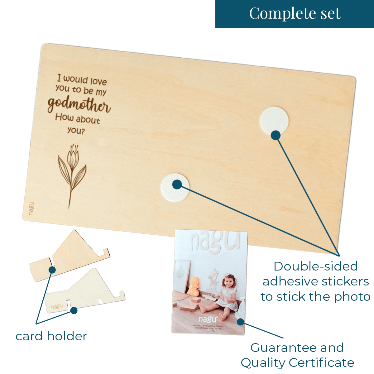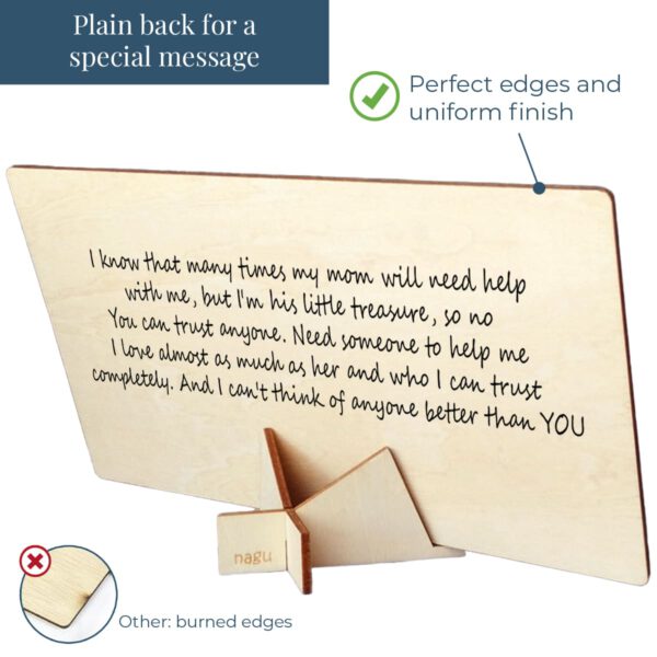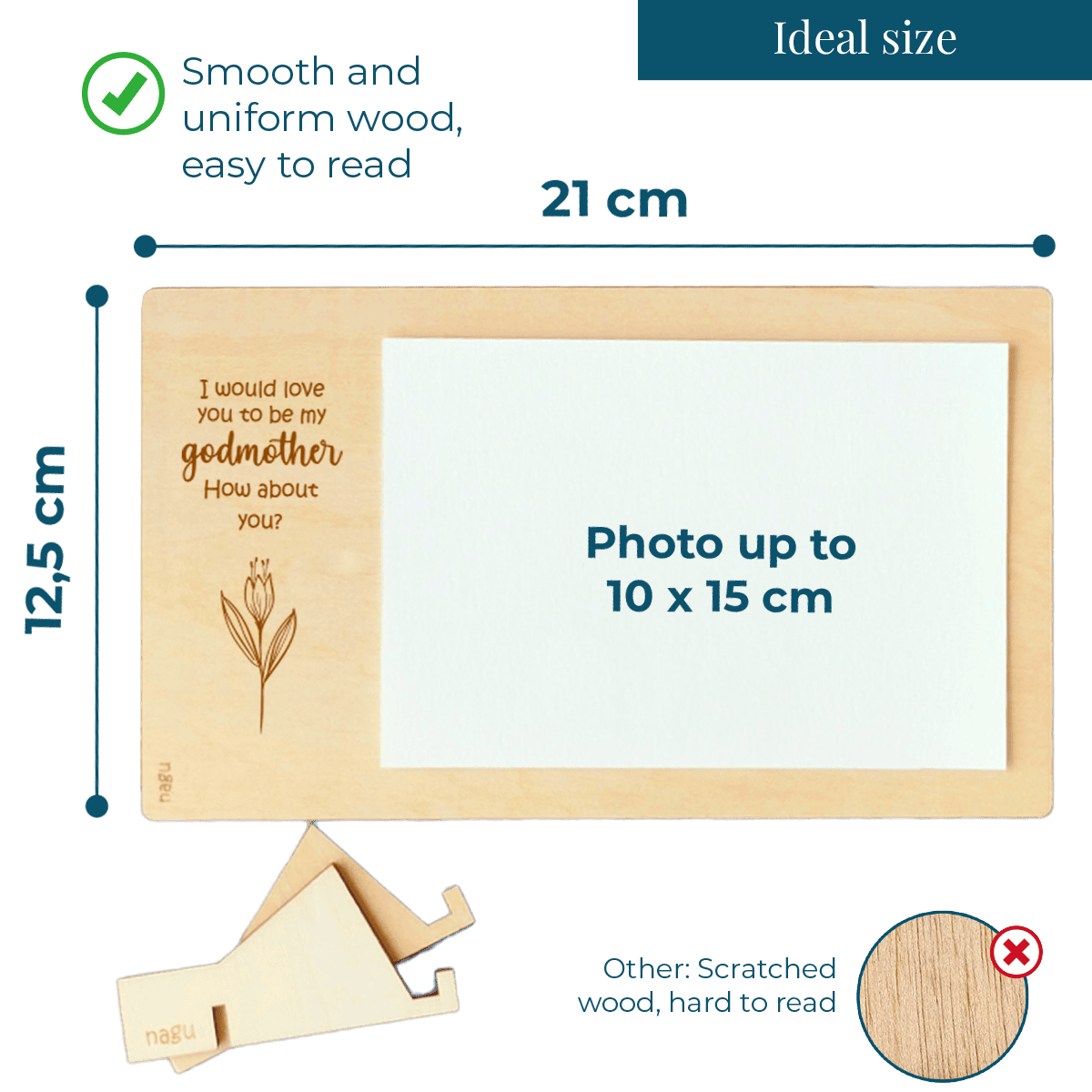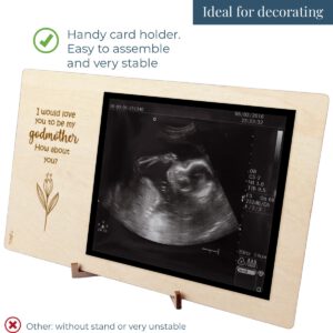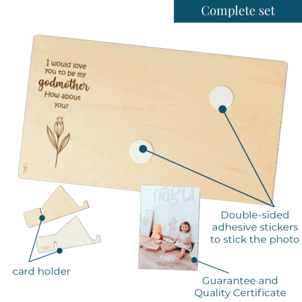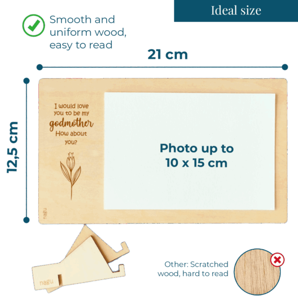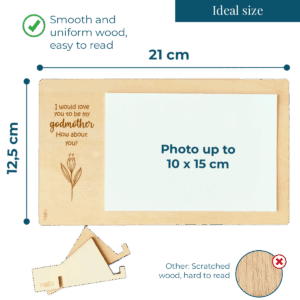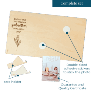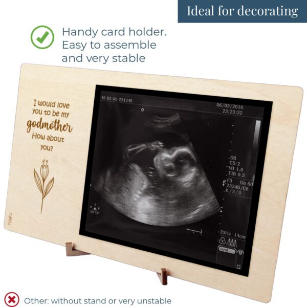 Wooden photo frame or ultrasound frame with a beautiful quote to announce the godfather or godmother proposal for a christening. You can decorate it with a beautiful photograph of the baby or the ultrasound, and write a lovely dedication on the back. Includes a table stand.