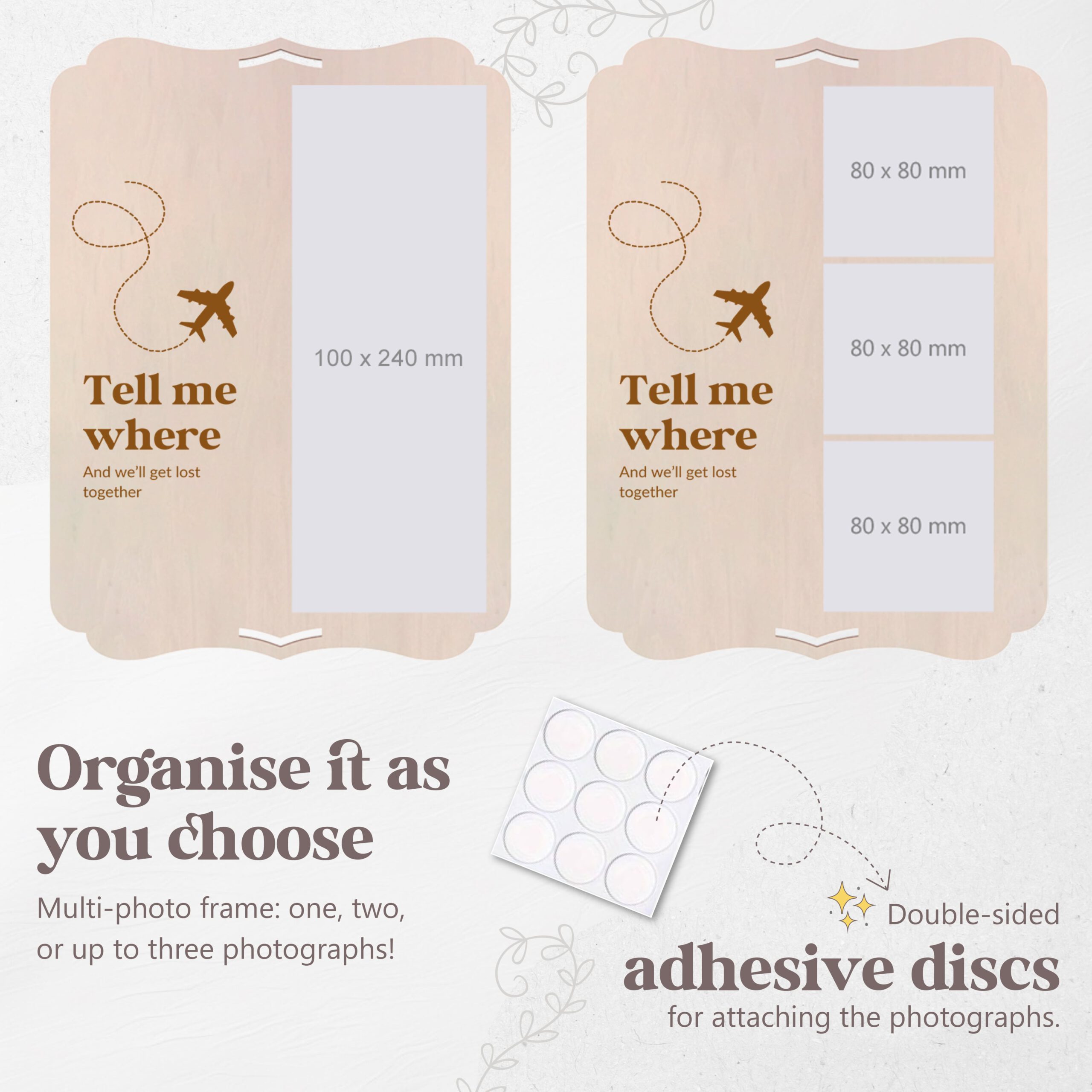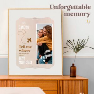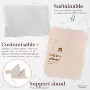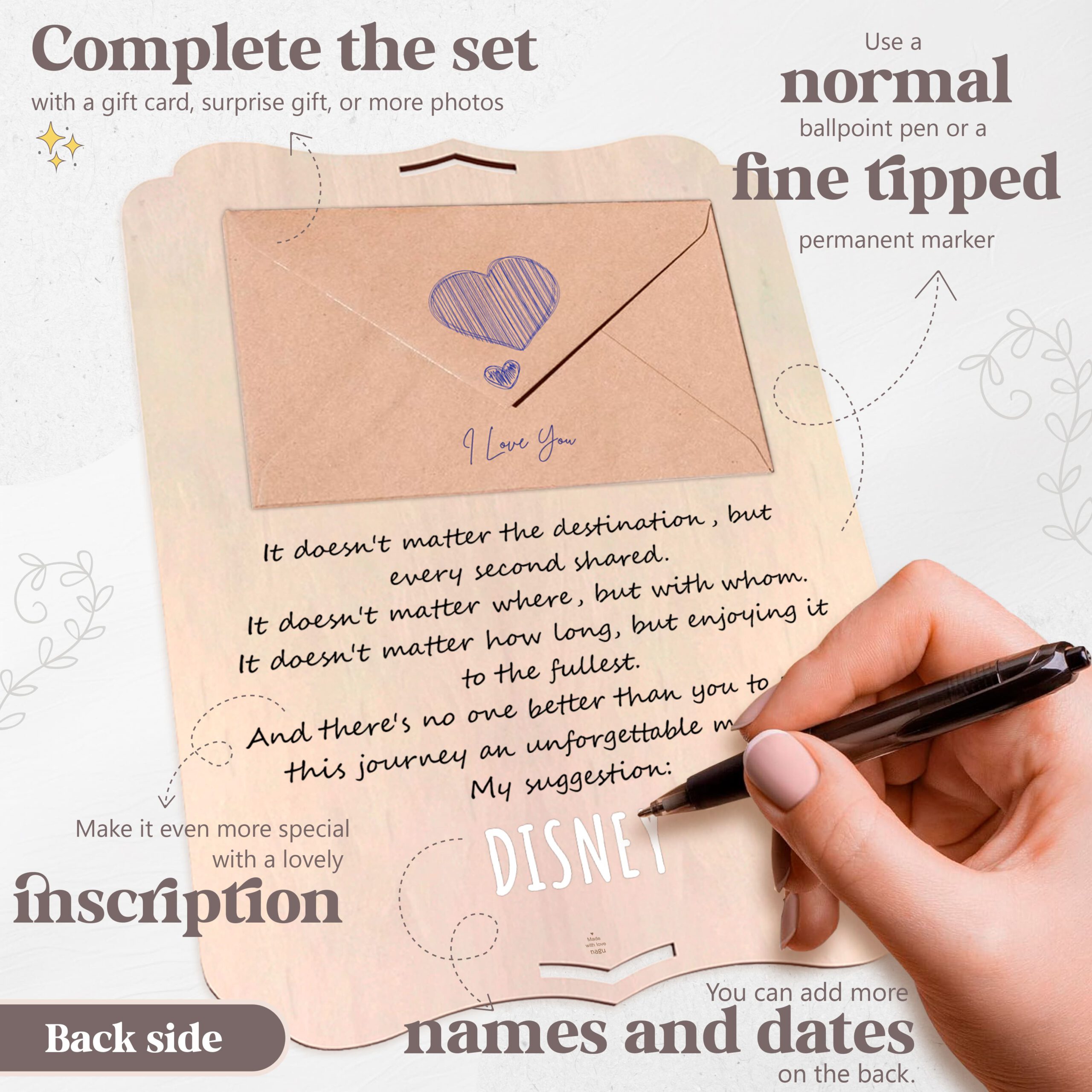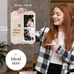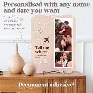 Wooden photo frame with a beautiful quote to give to that special someone. Includes a set of letters to personalize names, quotes, and dates. Includes adhesive for the photos, a tabletop stand, and a hanging hole. The back is smooth and beautiful, so you can stick more photos or decorate with a personal dedication, or add an envelope with a surprise gift such as plane tickets, a gift card, vouchers, a letter, or even money! A touching and lasting gift.