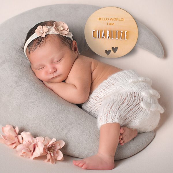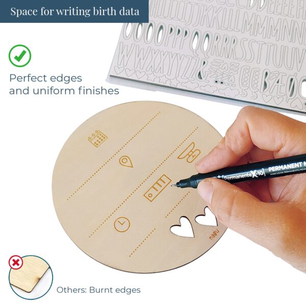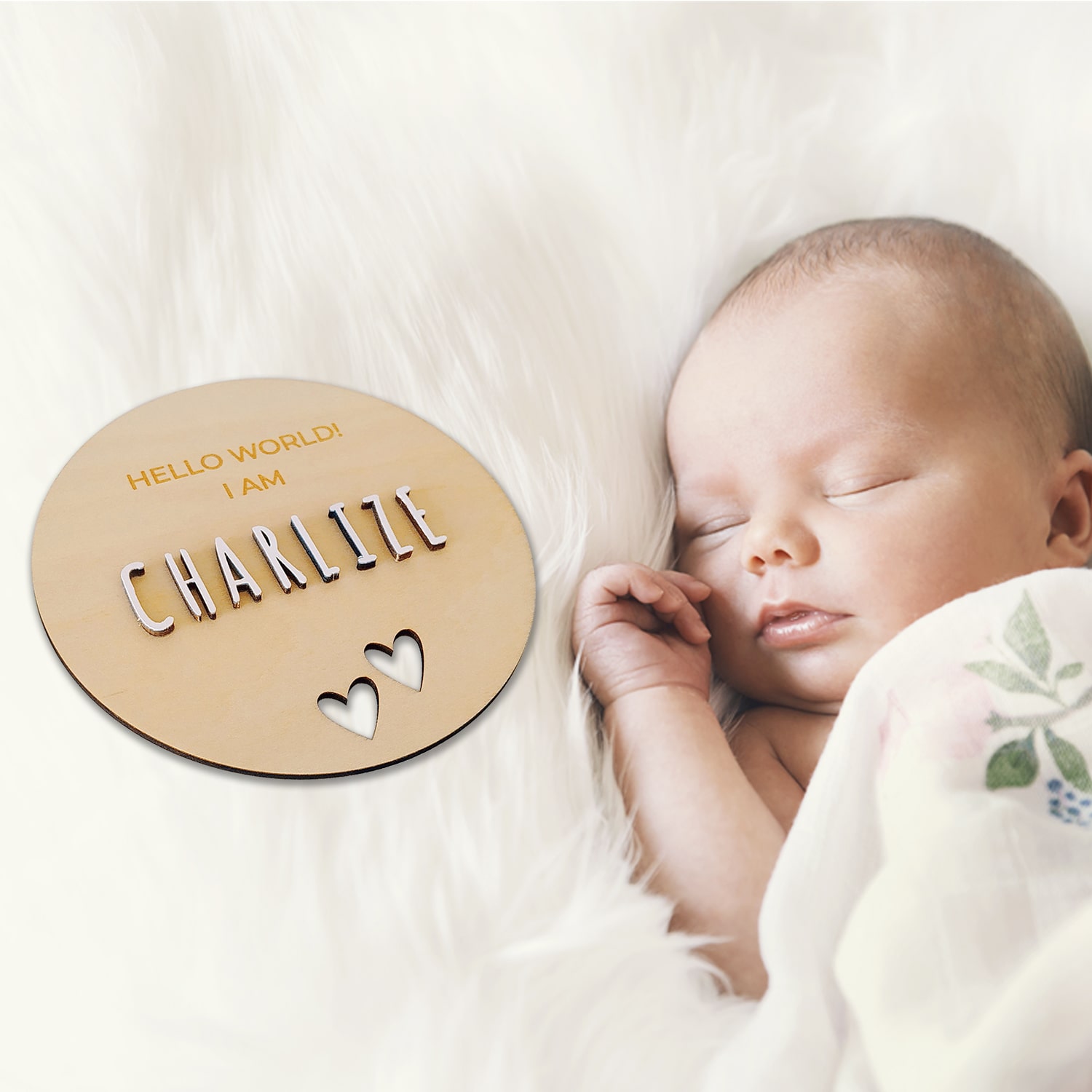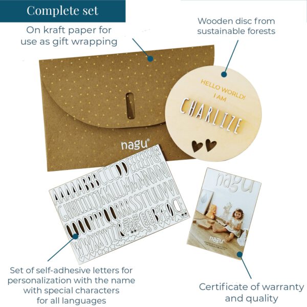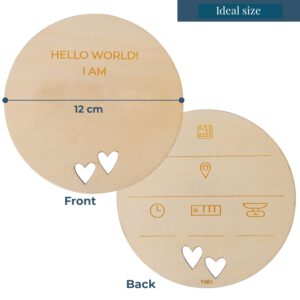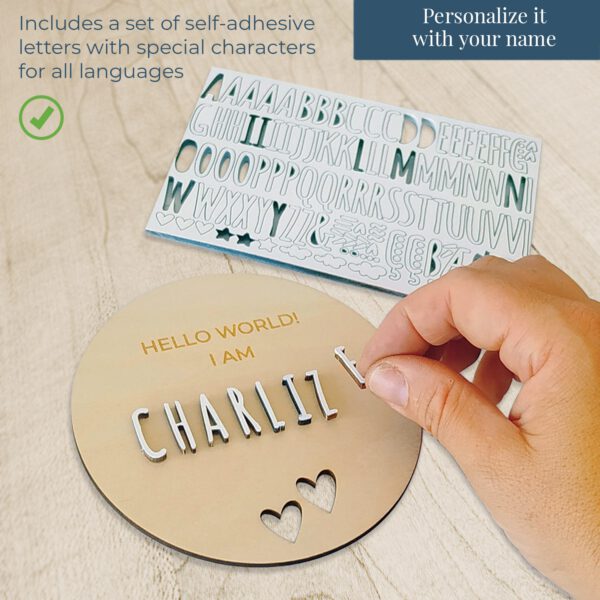 Wooden plaque to create a birth announcement for your newborn. On the front, with the phrase “Hello world, I am…” and the baby’s name, this plaque is the perfect choice for taking your baby’s first photograph and introducing them to the world. On the back, you can write down the most important details of their birth as a keepsake: measurements, location, weight, and more. This plaque creates a unique and emotional keepsake. It includes a set of wooden letters to mark the name and beautiful stars or hearts carved into the wood, which add a beautiful touch of depth to the photographs.