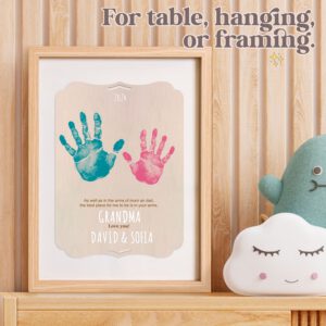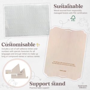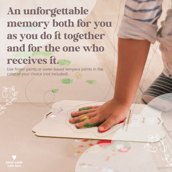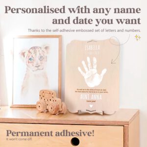 Wooden frame for recording baby handprints, footprints, or even those of the entire family. Customizable with names, phrases, and dates thanks to the set of self-adhesive letters and numbers. With a beautiful quote to give as a gift and touch the heart of whoever receives it. A personalized, unique, and original gift that everyone will love. It comes with a practical tabletop stand and hanging hole, making it a versatile and beautiful decorative piece.